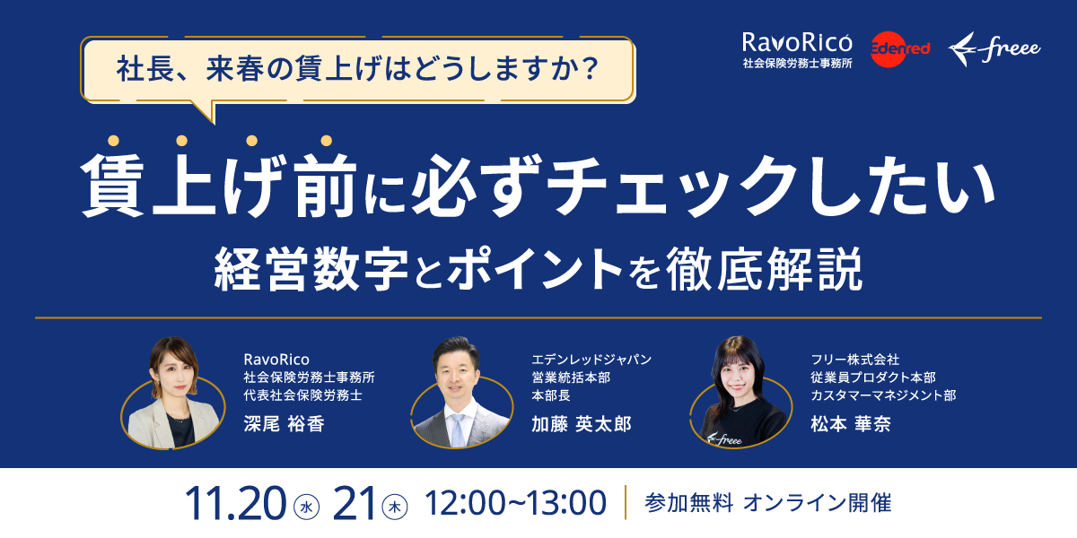 お役立ち情報 セミナーに登壇しました 2024年12月19日 2024年12月19日 RavoRico 2024年11月20日、21日に開催されたフリー株式会社様主催の オンラインセミナーにて、登壇の機会をいただきました。 今回のセミナーでは、賃上げをテーマにお話しさせていただきました。 引き続き、みなさまに有益となる情報をお届けしてまいります。